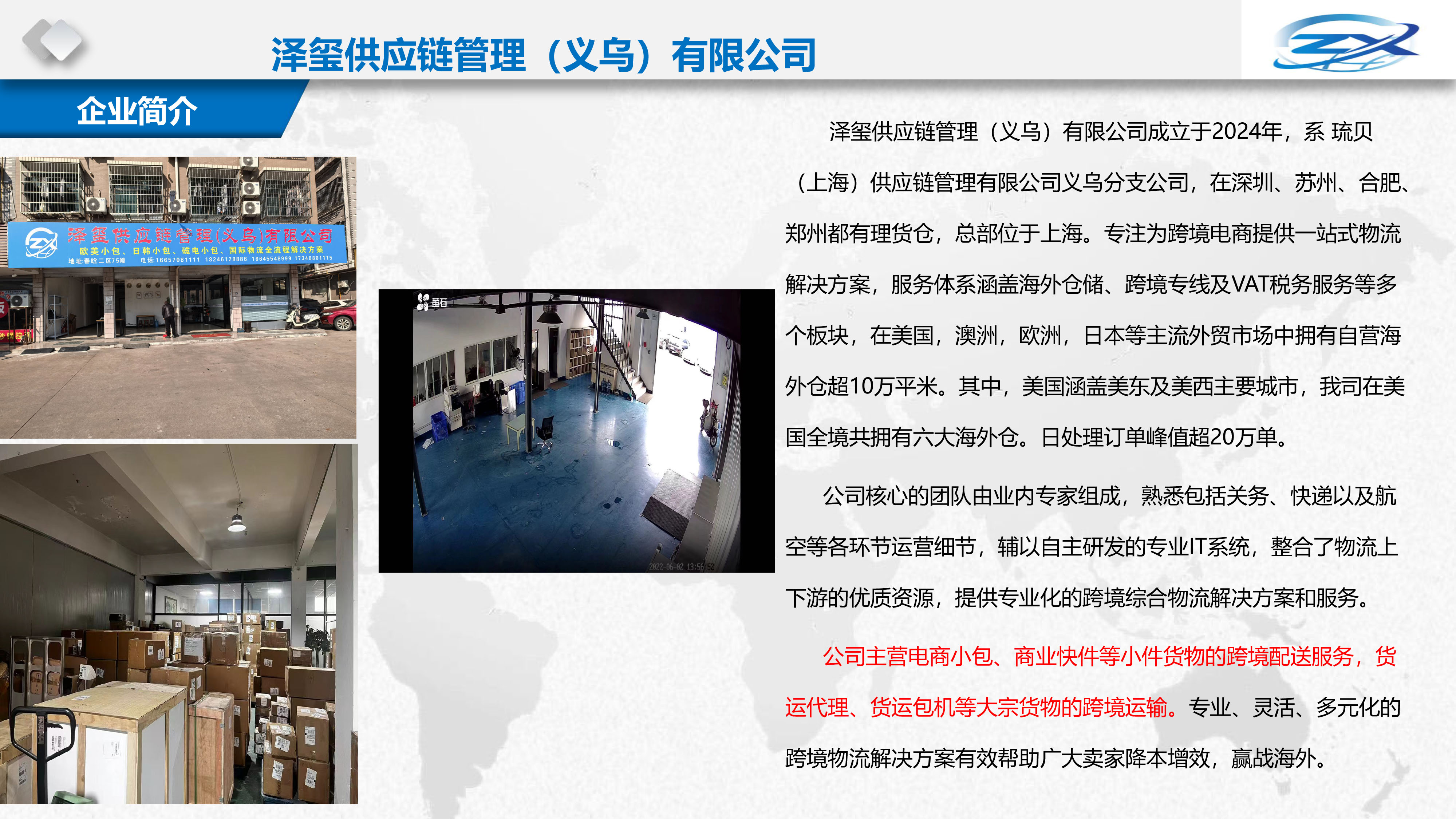 泽玺供应链管理(义乌)有限公司成立于2024年,在深圳、上海、苏州、莆田、广州、都有分支公司和理货仓。专注为跨境电商提供一站式物流